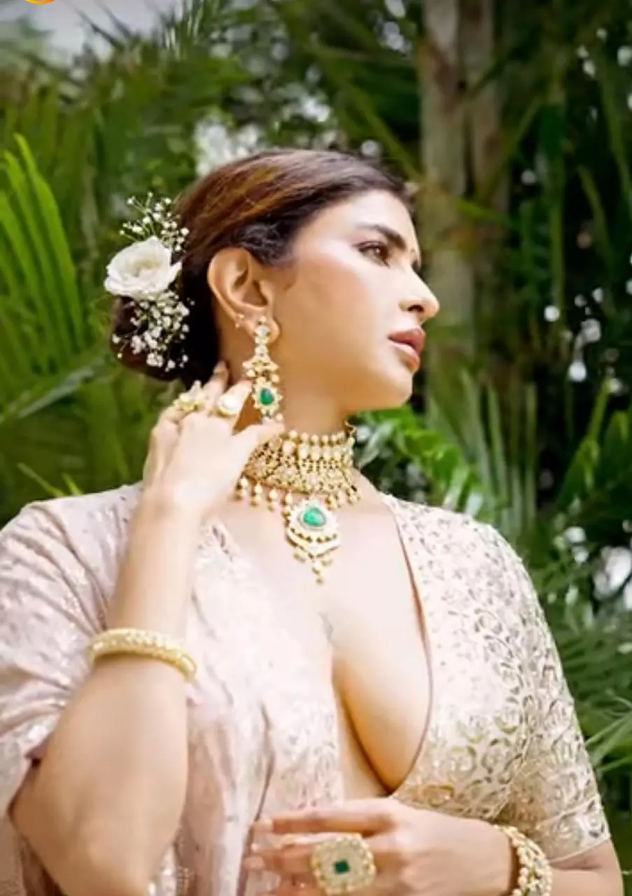 For the Diwali celebrations, Lakshmi donned a breathtaking cream-colored lehenga, featuring a low-neck blouse that perfectly accentuated her figure. The lehenga was paired with a flowing dupatta that added an air of elegance to her ensemble. To complete the look, she adorned herself with exquisite golden jewelry, including statement earrings and a delicate necklace, enhancing her festive vibe. Her high bun hairstyle further elevated the glamour, allowing her features to shine through beautifully.