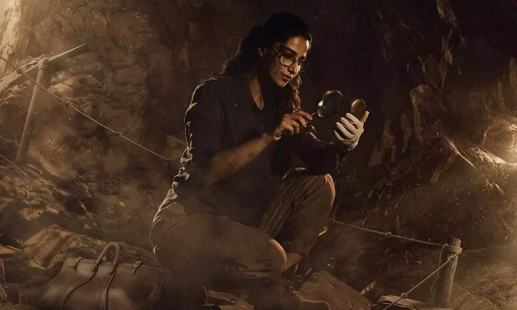 The makers have built huge excitement surrounding the project with the announcement and first look of Naga Chaitanya. Today, they have unveiled leading lady Meenakshi Chaudhary's look as Daksha. Playing an archaeologist, she is seen examing some artifacts in a huge cave.
