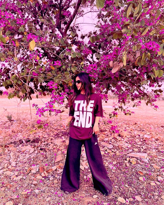 Recently, Nabha shared a picture on Instagram wearing a maroon shirt with the caption "THE END." She paired it with loose purple pants, black heels, and stylish accessories like black goggles. Her free-flowing hair added to her overall chic look, creating stylish stills for her fans to enjoy.