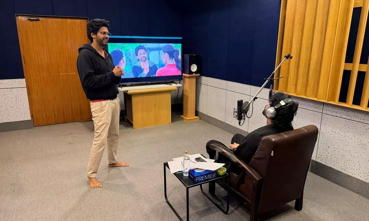 The producer shared an image that featured Naveen Polishetty at the dubbing studio, accompanied by a senior star seated before the mic.