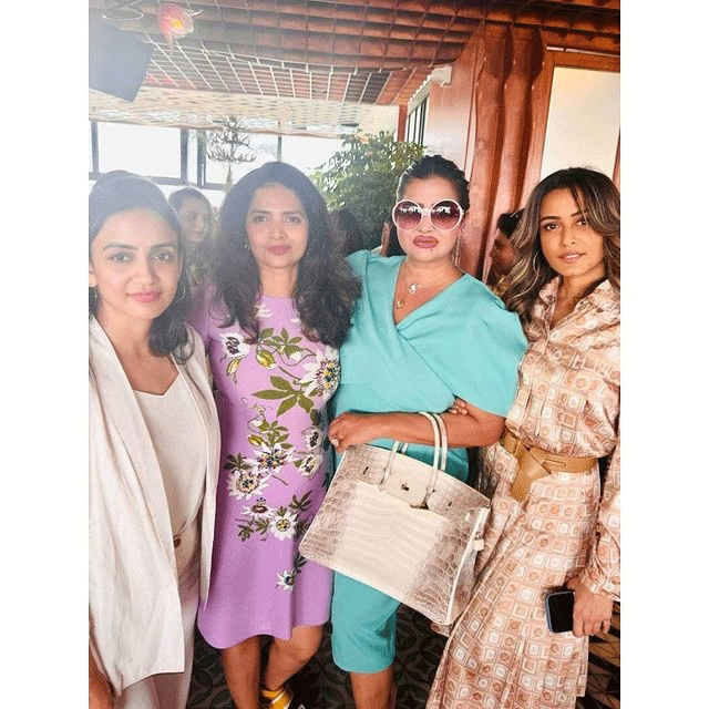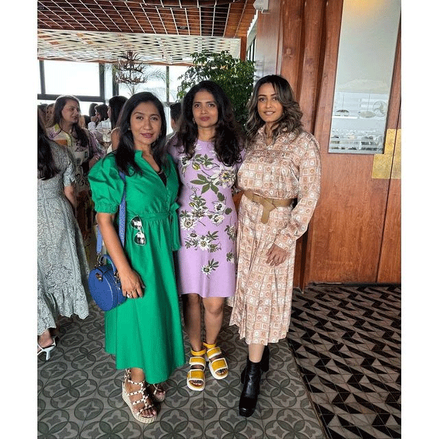 In her recent photos, she's dressed in a biscuit-colored collar neck maxi dress, elegantly cinched at the waist with a belt. Sporting free-flowing curly hair, she posed cheerfully alongside her friends. She captioned the pictures as 'a day out with ladies' and also extended birthday wishes to her friend Swathi.