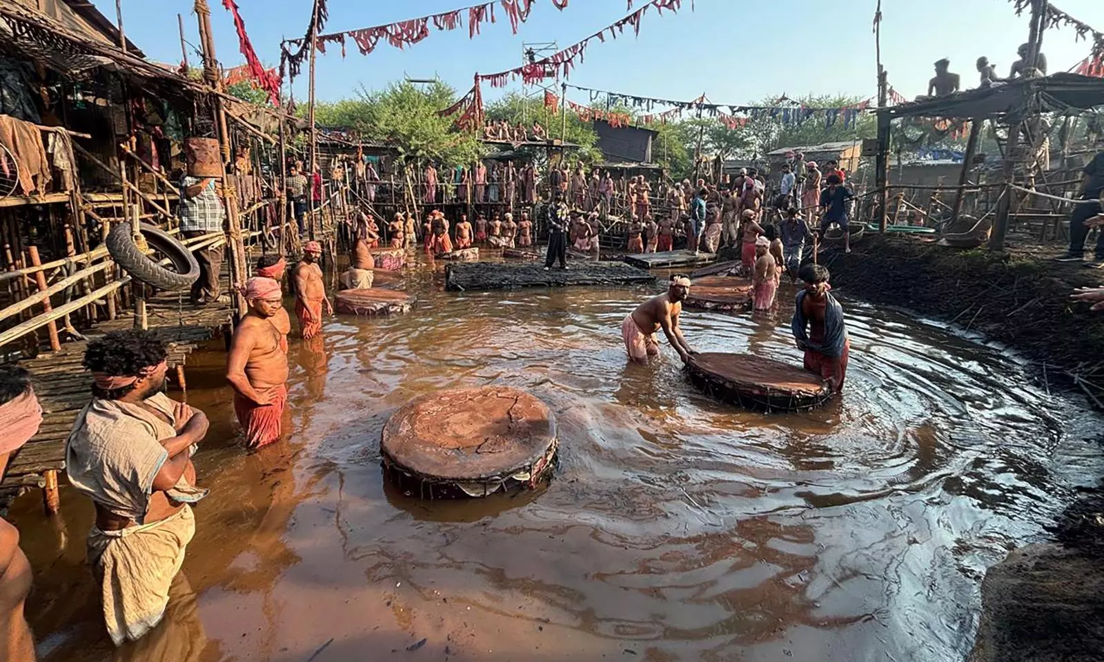 To shoot the song “Aaya Sher” from Nani’s The Paradise movie, it looks like the makers have done their biggest feat as director Srikanth Odela gets a slum-set involving several houses, arches, walls, and drainage built on a 2.5-acre land parcel. Along with the hero house set, which resembles that of a Kaman, they have built a village with several houses and with a large waterbody, a giant biryani bowl-like structure, and also a big dump yard adjacent to that. Involving a lot of construction workers and artisans, the sets took almost 20-30 days to build.