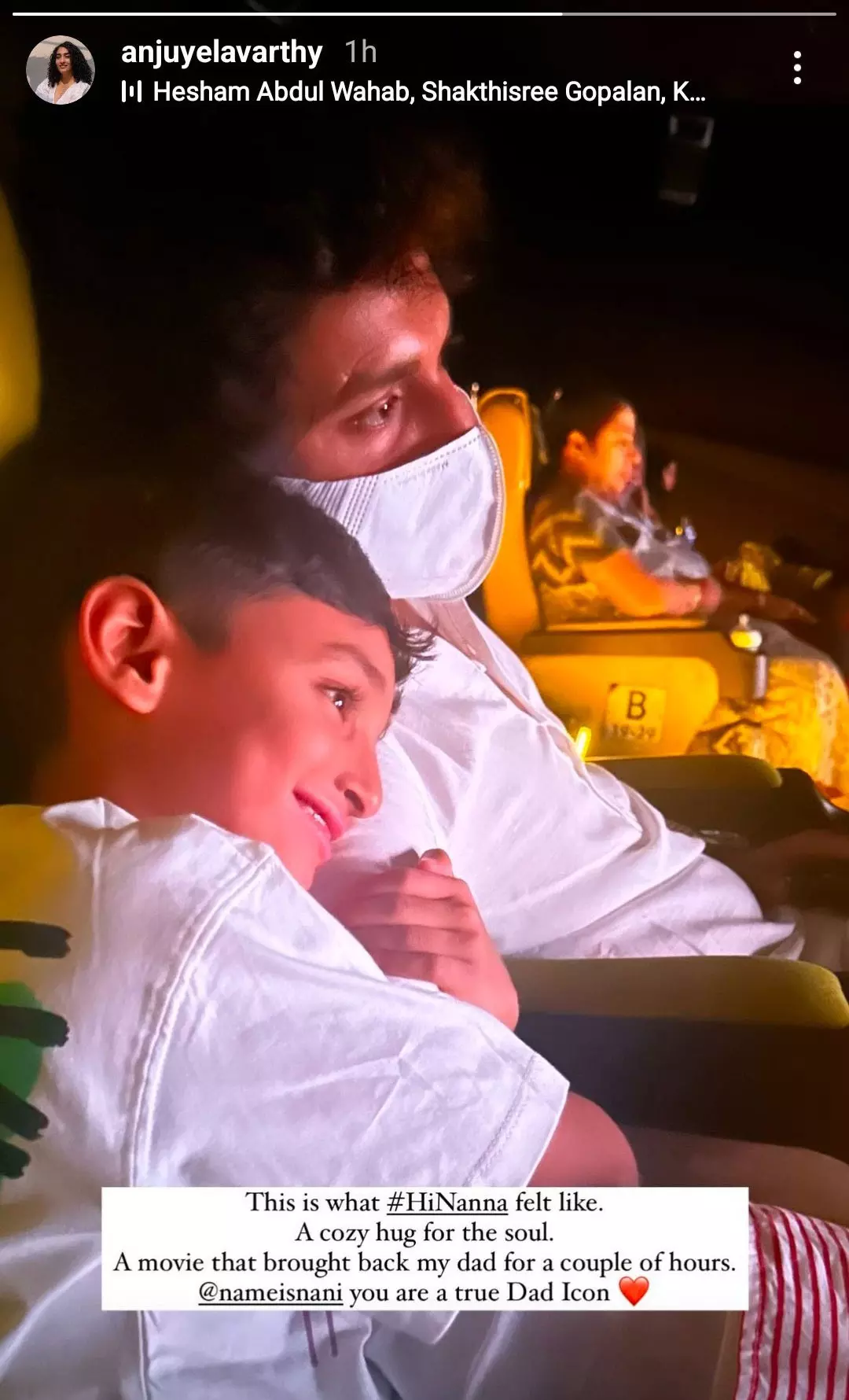 Nani and his family watched the movie in a theatre on the first day and it was a great experience. Nani's wife Anjana Yelavarthy shared a heartwarming picture of Nani being close to tears while watching the movie and his six-year-old kid Arjun aka Junnu is hugging him in an endearing fashion. She wrote, “That is what #HiNanna felt like. A cozy hug for the soul. A movie that brought back my dad for a couple of hours. @nameisnani you are a true Dad Icon.”