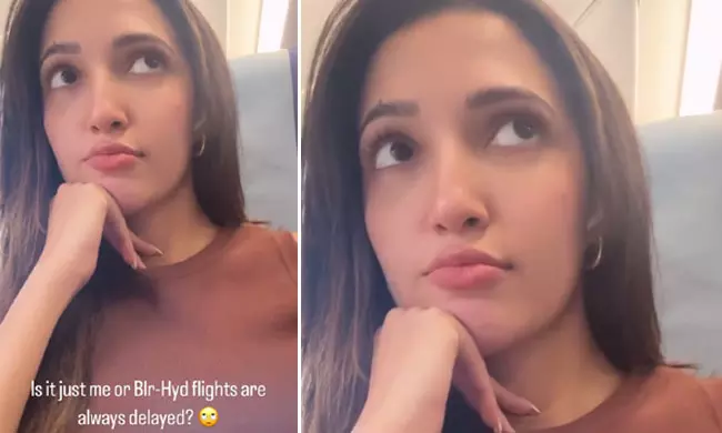 The actress, who was last seen in the film Gangs of Godavari, took to social media to share a small but relatable frustration. Wearing a brown tank top and a gloomy expression, she posted a video from her flight seat, captioned, “Is it just me or Bangalore to Hyderabad flights are always delayed?” Her tired face and the window-side view captured the mood perfectly.