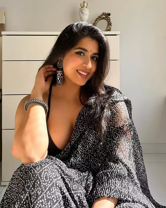 Recently, Nikitha has been sharing glimpses of her life on Instagram, showcasing her elegant style in a black saree with a white printed design, a sleeveless black blouse, jhumkas, bangles, and free-flowing hair.