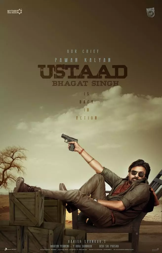 They say that 'Ustaad Is Back In Action' and it is going to be a massive schedule and the team is currently shooting some power-packed sequences. We can see Pawan sitting in a chair while resting his legs on wooden boxes. With sunglasses on, he is holding a gun in his hand. The stylish mass poster is going viral and fans are getting very excited about this movie.