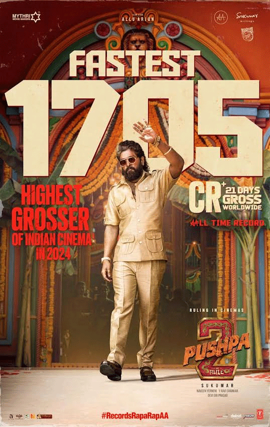 Fastest to ₹1700 Crores: Pushpa 2 has become the fastest Indian film to reach a worldwide gross of ₹1700 Crores, achieving this milestone in just 21 days.