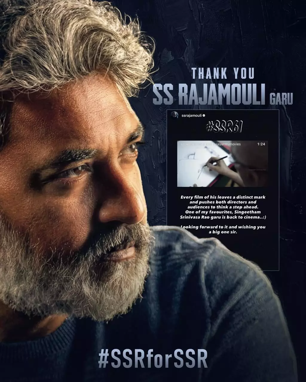 Wishing Singeetham on his return to direction with SSR61, Rajamouli wrote on his Instagram story, "Every film of his leaves a distinct mark and pushes both directors and audiences to think a step ahead. One of my favourites, Singeetham Srinivasa Rao garu is back to cinema. Looking forward to it and wishing you a big one sir."