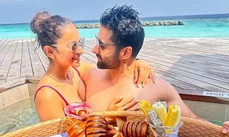 Rakul recently posted a gorgeous Instagram story from their Maldives vacation to commemorate their important day. Wearing sunglasses and looking into each other's eyes, the couple was spotted spending a comfortable moment in the swimming pool while wearing chic beachwear. Their romantic getaway left people swooning because their connection was just too hot to bear.
