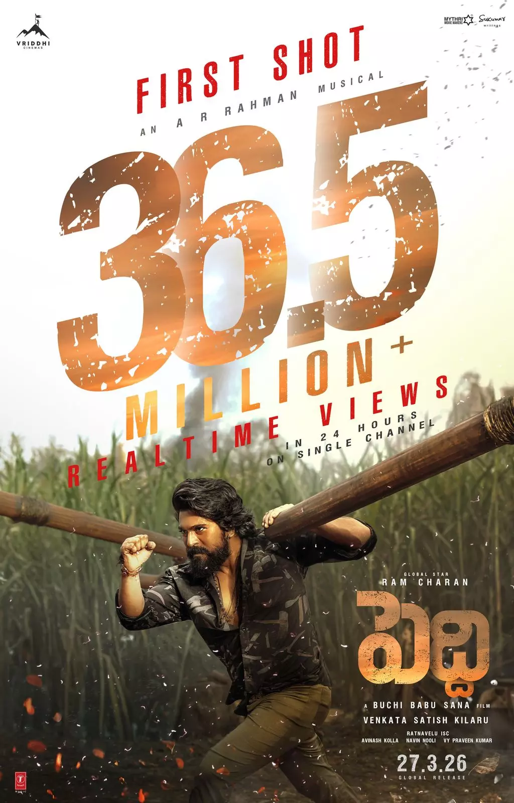 Peddi first shot glimpse has crossed 36.5 Million plus views in just 24 hours, in Telugu language, only. This is a phenomenal record and it is an indication for the kind of thunderous response the glimpse has been receiving all over. Not just in Telugu, the glimpse has been hot trending topic in every language it released showcasing Ram Charan's reach all over India.