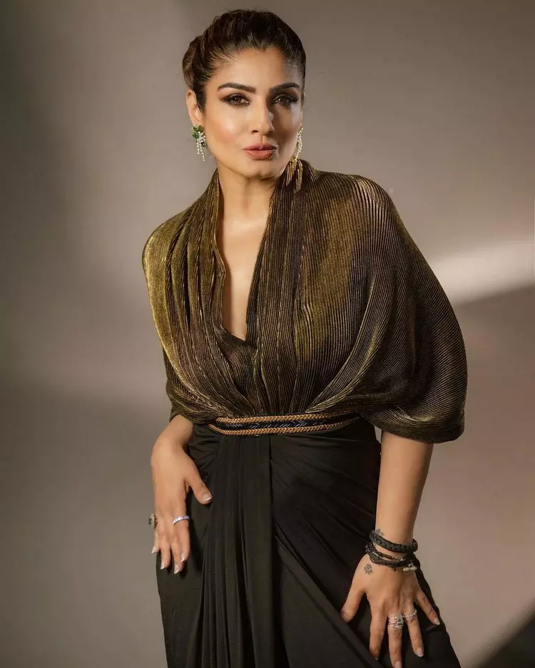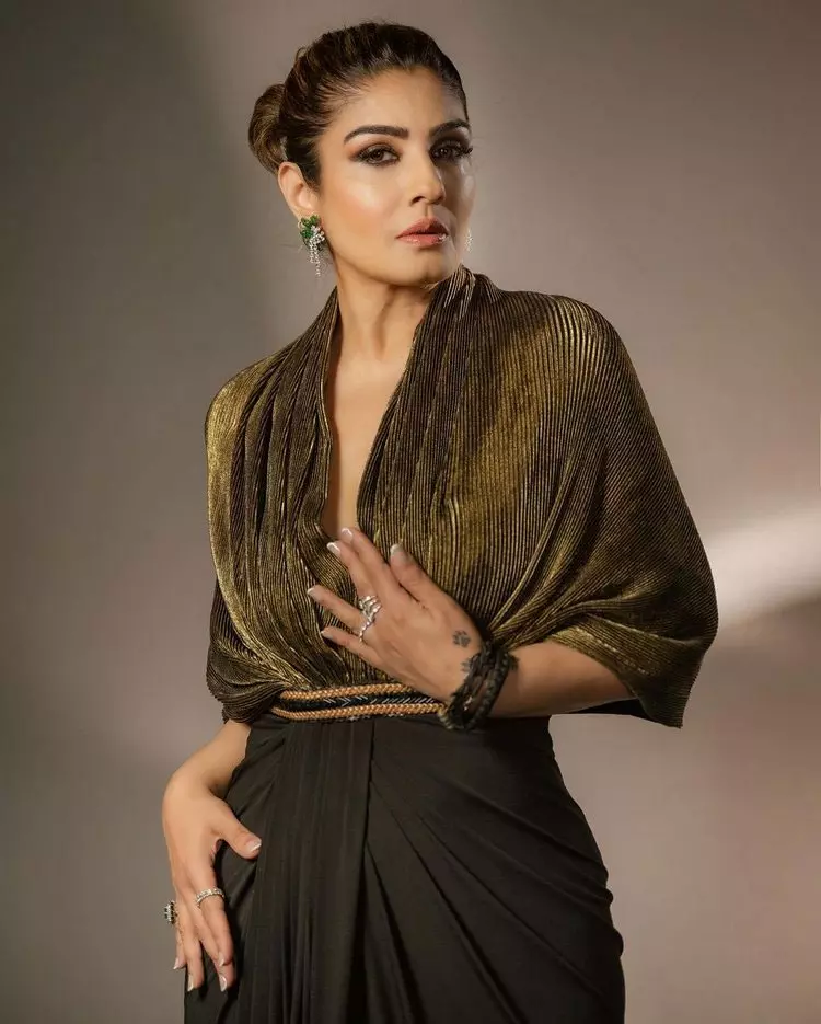 Her latest appearance garnered attention as she donned a gold jersey cap saree gown, elegantly flaunting her toned physique. Paired with black heels and accessorized with green hangings, Raveena exuded sheer glamour and sophistication. Her fashion choices have always been applauded for their uniqueness and elegance, and this look was no exception, reaffirming her status as a style icon.