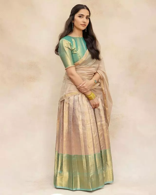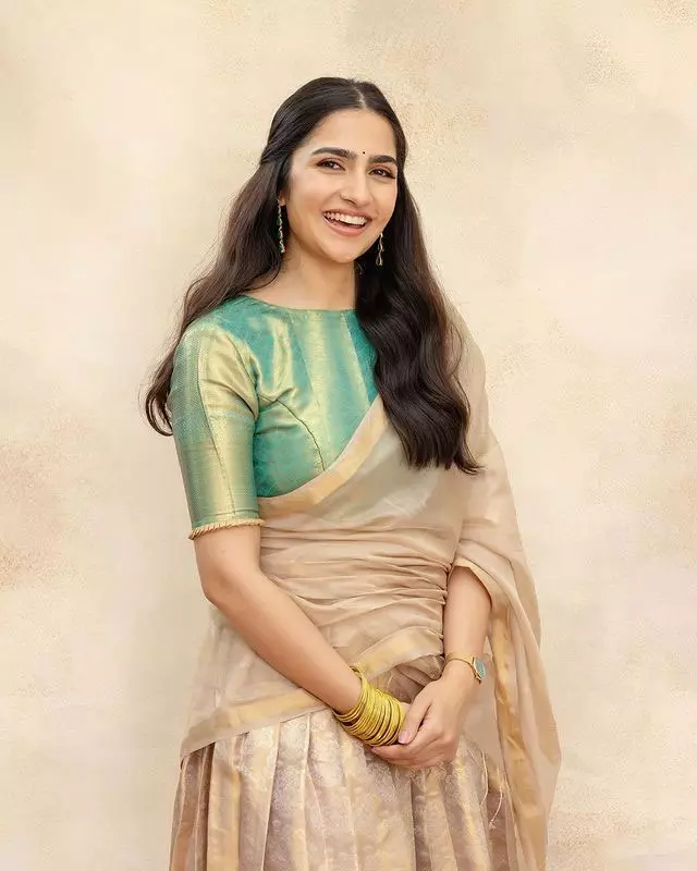 Engaging with her fans on Instagram, Rukmini recently shared delightful pictures with her mother. In the images, she radiates charm in a pattu bottle green blouse, a gold saree, and adorned with flowers in her hair. Her caption, "Muhurta mood ✨💛," reflects the joy of the moment, inviting followers to swipe for a glimpse of her mother's muhurta.