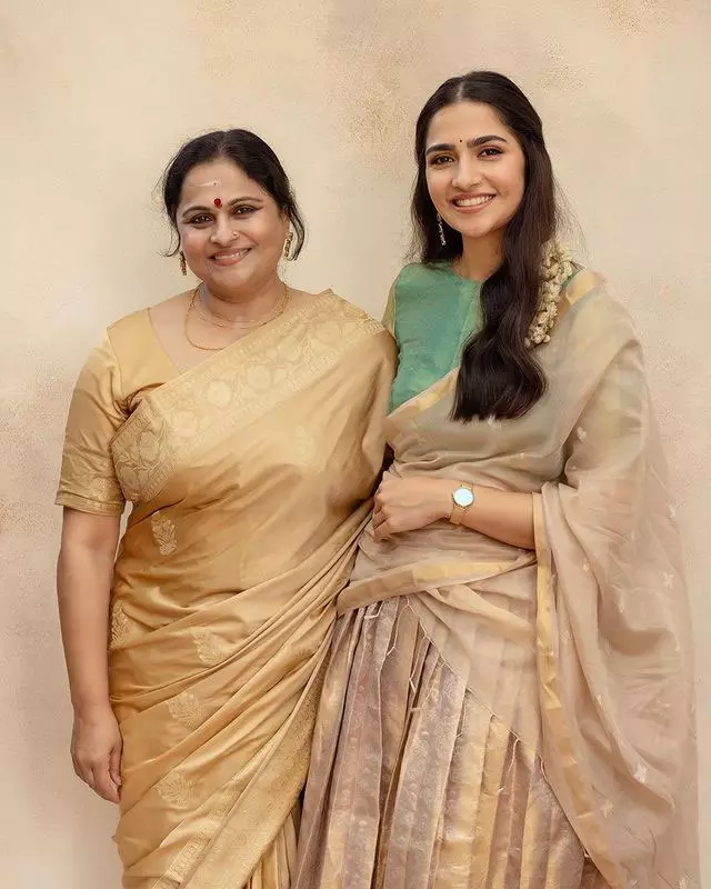 Engaging with her fans on Instagram, Rukmini recently shared delightful pictures with her mother. In the images, she radiates charm in a pattu bottle green blouse, a gold saree, and adorned with flowers in her hair.