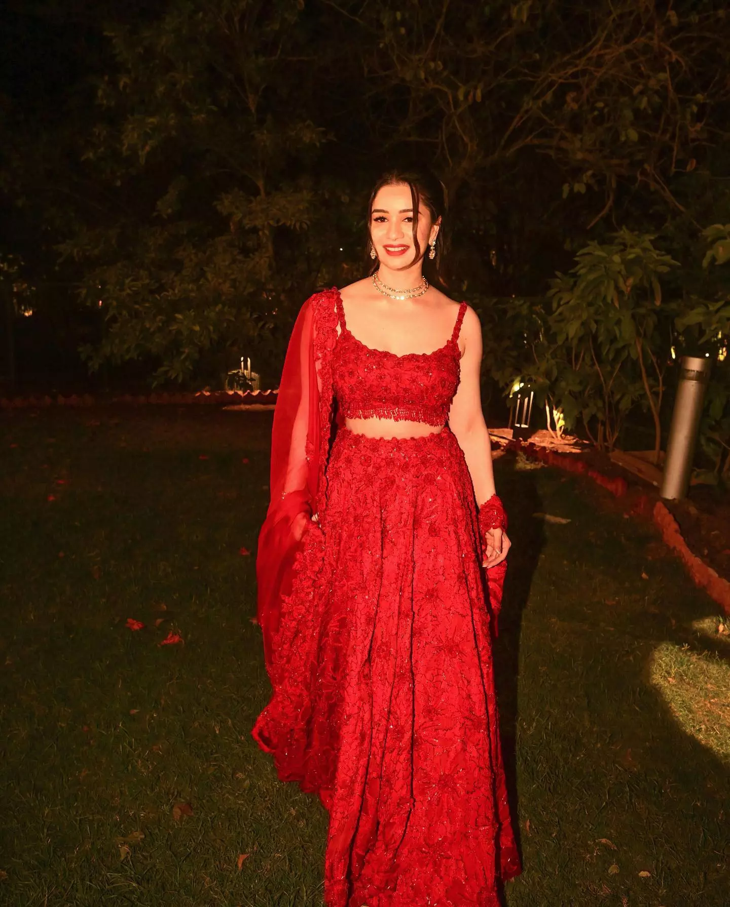 Decked out in a beautiful red lehenga, Sara looked like a red cherry, with a sleek ponytail, a diamond neck chain, and adorable makeup.