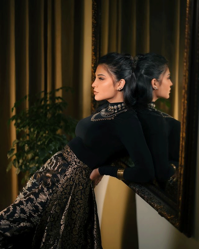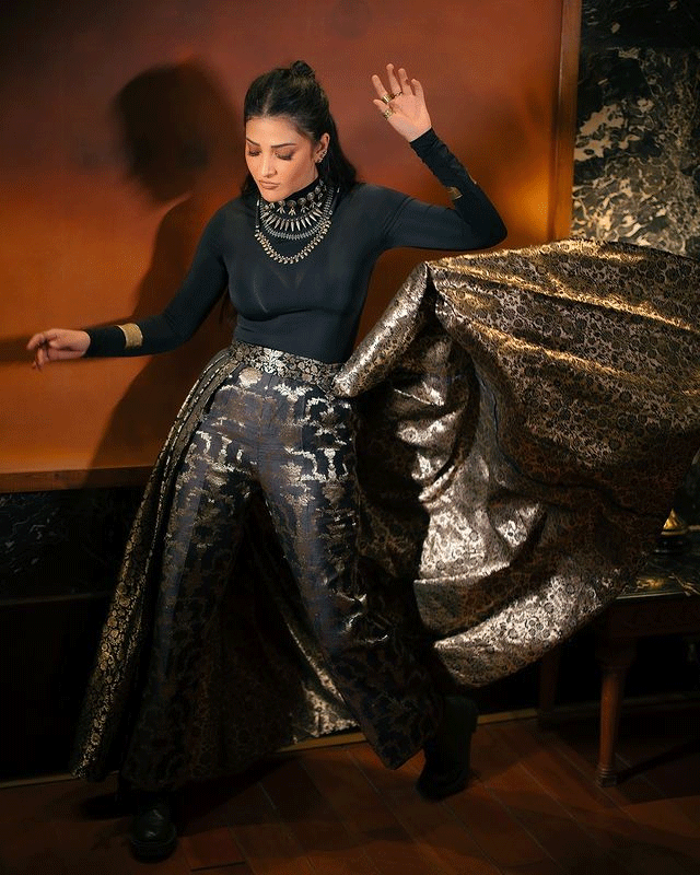 In a recent Instagram post, Shruti further showcased her distinctive fashion sense. The image featured her in a stunning black outfit that combined elegance and modernity. The caption read, "I can be your favourite pain 🧡,". Shruti’s attire included a sleek black top paired with a patterned skirt, adorned with intricate golden designs. The look was completed with bold accessories, creating a perfect blend of classic and contemporary styles.