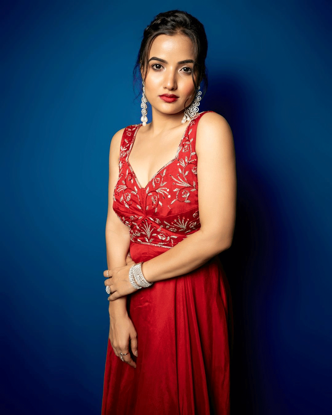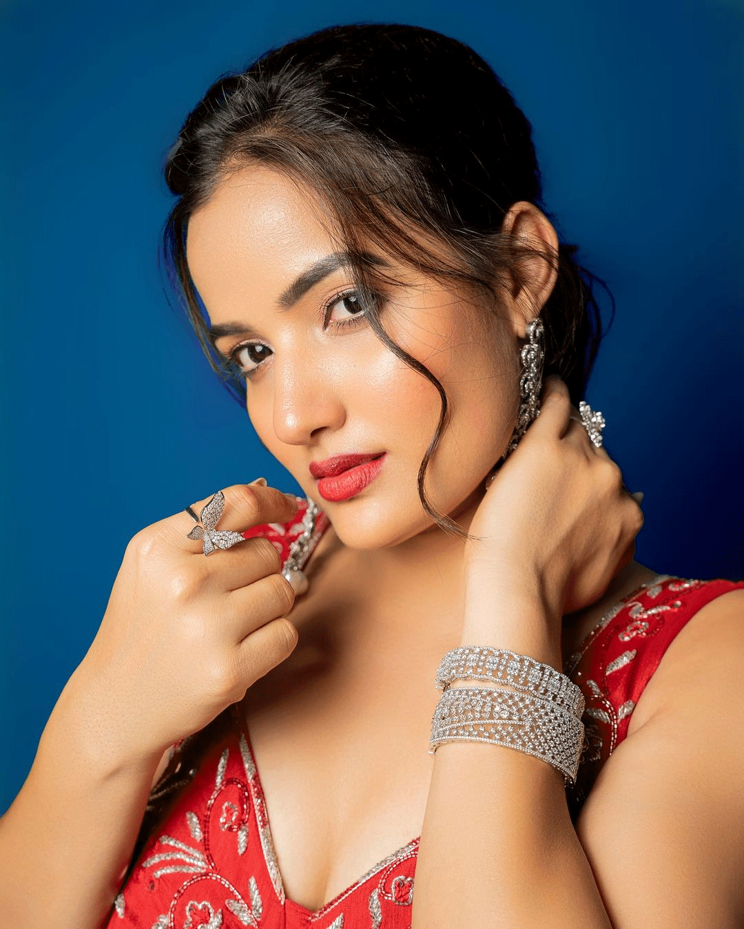 Siri is a vision in a sleeveless red top adorned with intricate embroidery. The top perfectly complements a matching lehenga that flows gracefully around her. To complete the look, she opted for statement silver earrings that add a touch of glamor. A sleek high bun keeps her hair styled and allows the focus to remain on her stunning makeup.