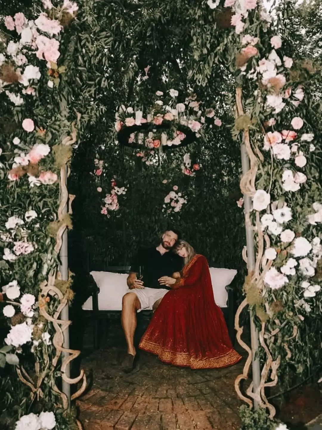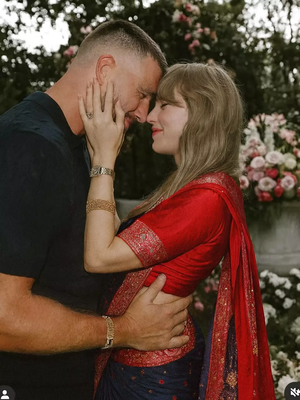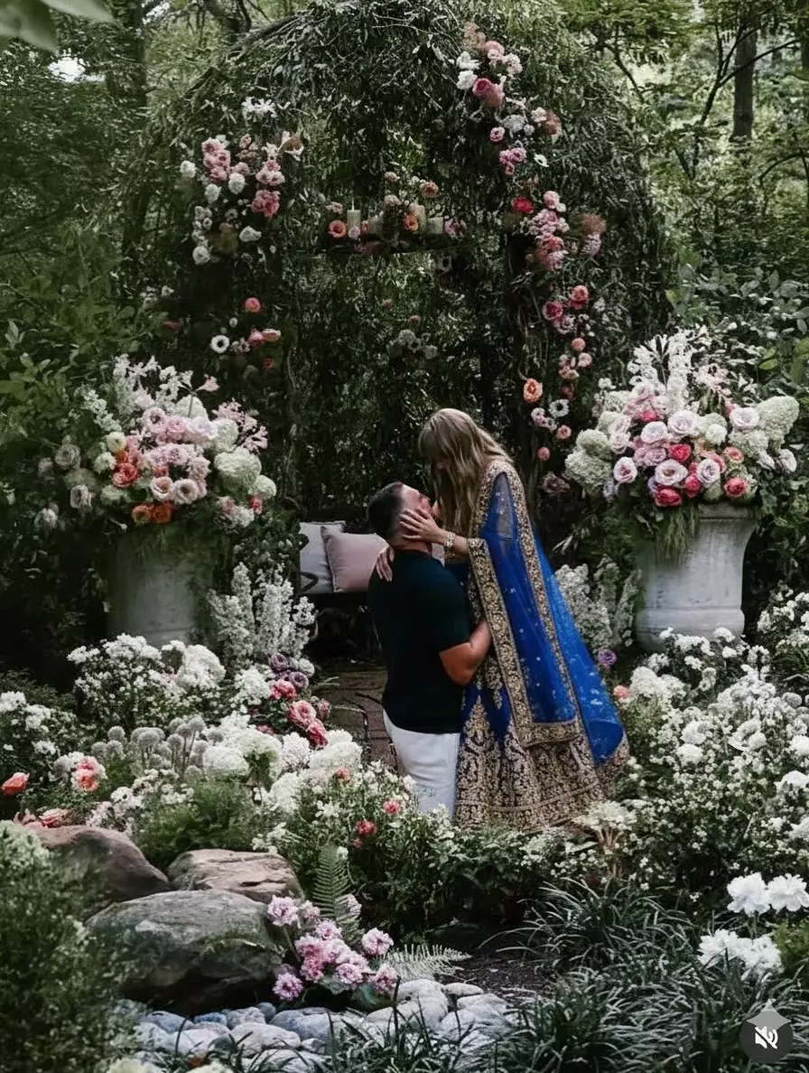 The images show Taylor in three bridal avatars, a blue saree with a red blouse, a royal blue lehenga in a garden setup, and the classic red lehenga that screams tradition. While she slipped effortlessly into desi glam, Travis remained in his casuals, a detail that amused fans as much as the outfits themselves.