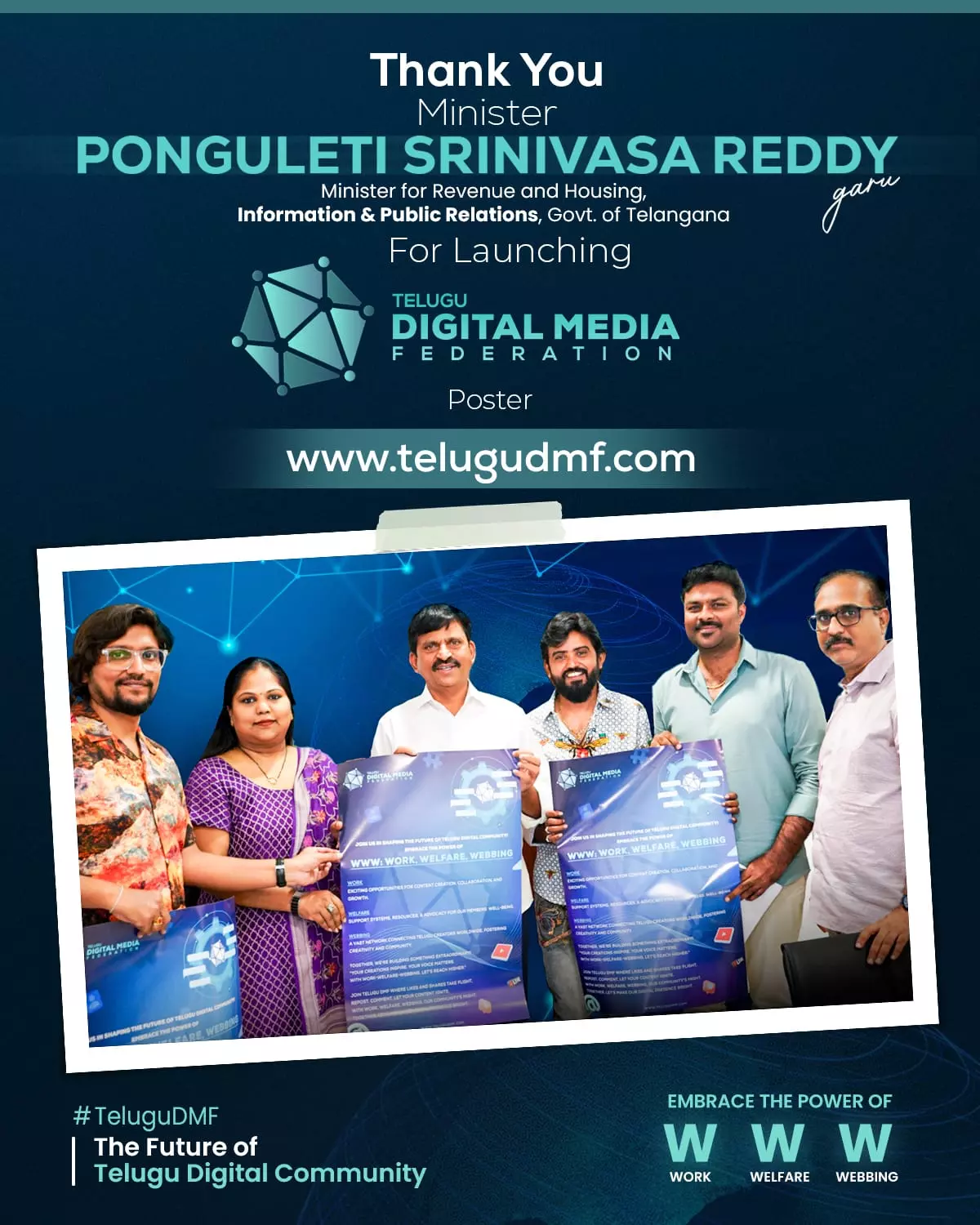 Telangana Government Pledges Support Telangana's Information & Public Relations Minister Ponguleti Srinivas Reddy echoed Chiranjeevi's sentiments by inaugurating the logo and poster. Recognizing the power of digital content, he pledged the state government's support for TeluguDMF.