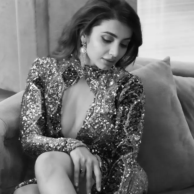 The dress she wears is a short gold-colored outfit with a neckline that dives down, revealing more skin. This style choice accentuates her figure and draws attention to her appealing appearance. Alongside her attire, Tejaswi's makeup and poses add to the overall appeal of the picture. Her makeup seems to emphasize her natural features, enhancing her already captivating looks.