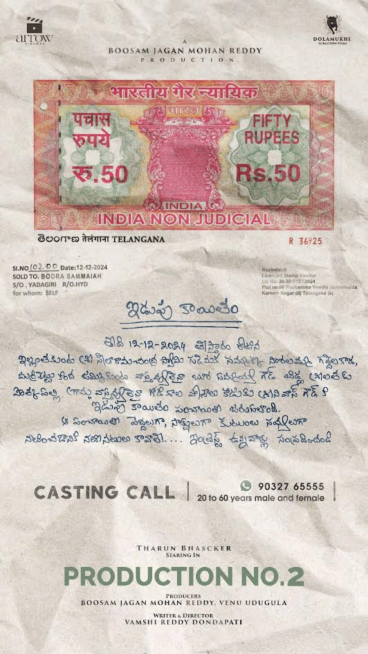 Arrow Cinemas and Dolamukhi Subhultron Films are seeking genuine talents aged between 20-60 years for their second production venture, a rural romantic comedy-drama starring Tharun Bhascker. Directed by Vamsi Reddy Dondapati and produced by Boosam Jagan Mohan Reddy, with contributions from writer-director Venu Udugula, this project promises to be a captivating cinematic experience.
