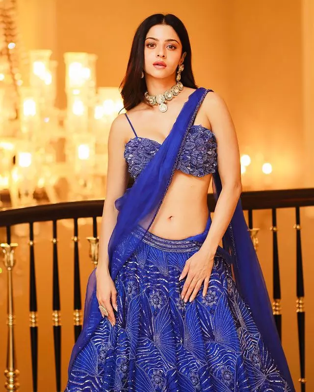 In the picture, Vedhika is dressed in a mesmerizing blue lehenga adorned with intricate designs. The designer lehenga paired with a netted dupatta accentuates her grace and elegance. With a beautiful choker completing her look, Vedhika exudes confidence and charm, leaving fans in awe of her beauty.