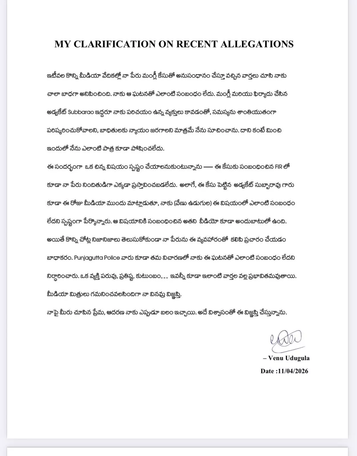 Venu Udugula also expressed disappointment over how his name was unnecessarily dragged into the matter. He requested people not to believe false news without knowing the facts. He thanked his supporters and said their love and trust give him strength. "I request everyone not to believe false propaganda and to understand the truth," he added.