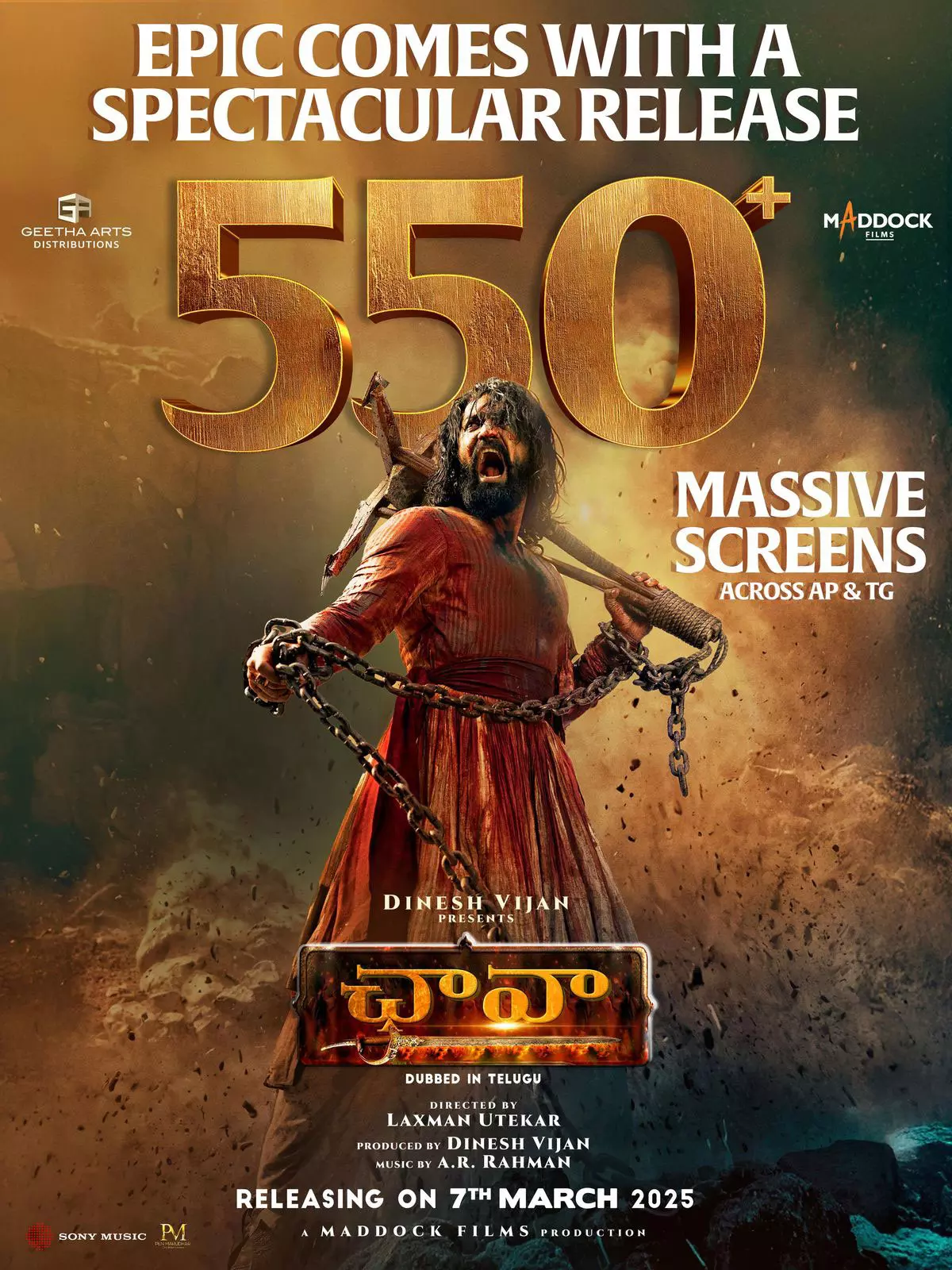 By: Tupaki Desk | 6 March 2025 1:33 PM ISTChhaava film starring Vicky Kaushal, Rashmika Mandanna, Akshaye Khanna has become a huge blockbuster collecting Rs.500 crores plus gross worldwide. The movie produced by Dinesh Vijan and directed by Laxman Utekar is being released in Telugu by Geetha Arts distribution. The movie is releasing tomorrow in massive 550+ screens in Telugu States.