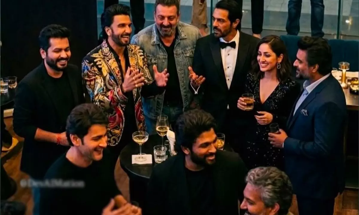 Apparently, someone has generated a picture where the whole team of Dhurandhar, including director Aditya Dhar, actors Ranveer Singh, Arjun Rampal, Sanjay Dutt and others, are actually partying in a pub along with the Telugu stalwarts like Mahesh Babu, SS Rajamouli and others. One can easily infer that these people are the ones who have actually made Dhurandhar and who have praised Dhurandhar. But the joke is about the people standing outside the glass doors of the pub.
