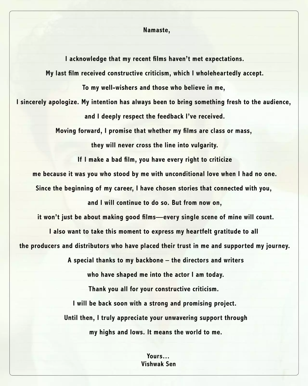 Vishwak Sen concluded by reassuring his fans that he will be back soon with a strong and promising project. He thanked everyone for their constructive criticism and unwavering support, promising to deliver content that resonates with them. Until then, he expressed his appreciation for those who have stood by him through his highs and lows, stating that their support means the world to him.