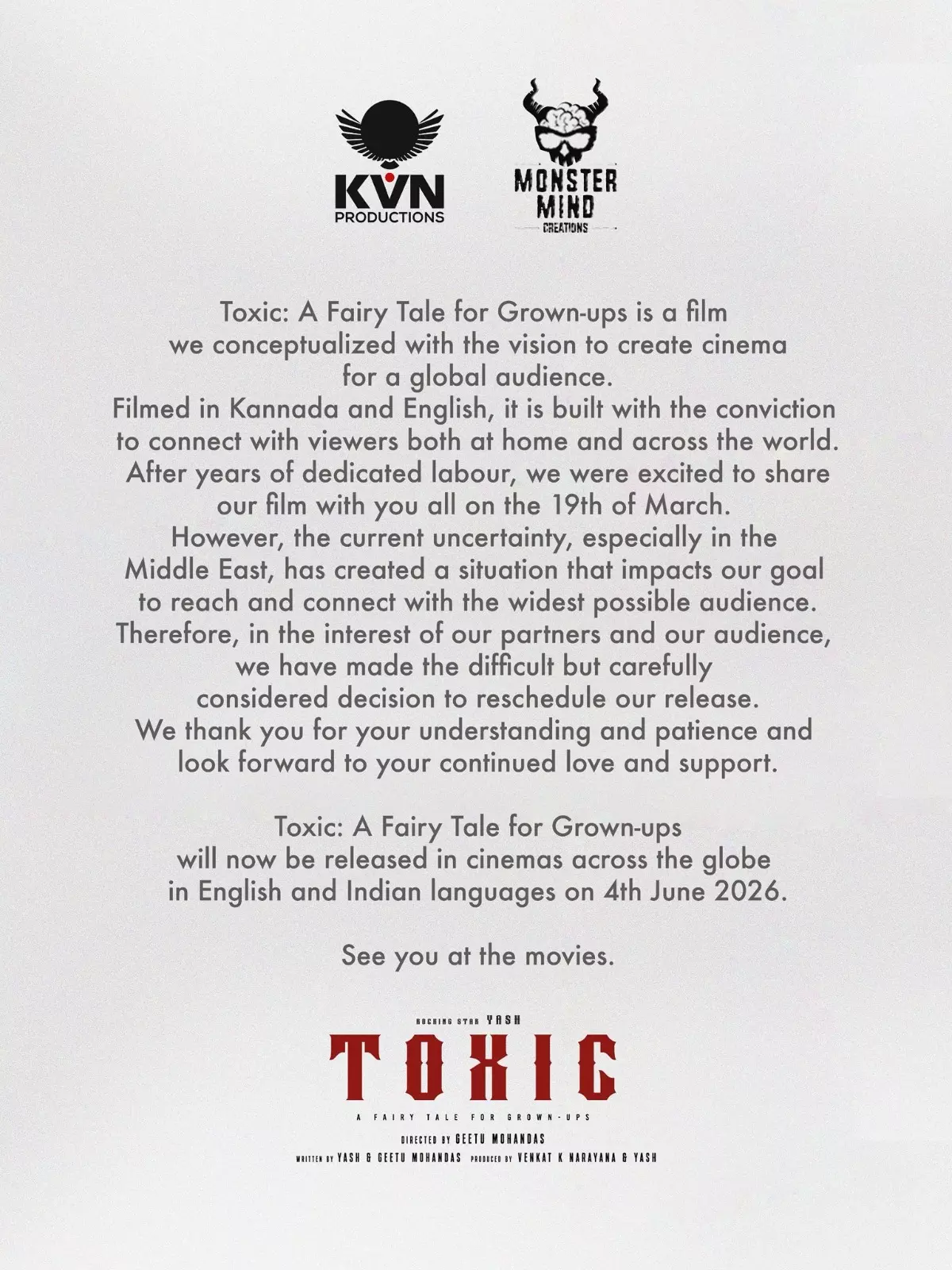 Filmed in Kannada and English, Toxic is built with a lot of conviction by director Geetu Mohandas, and Yash announced that the film should reach the widest possible audience before confirming that the film will be postponed. The film will now be released across the globe in English and other Indian langauges on June 4th, 2026.
