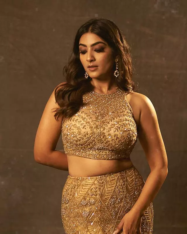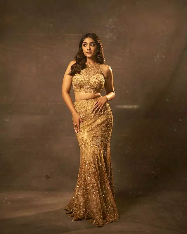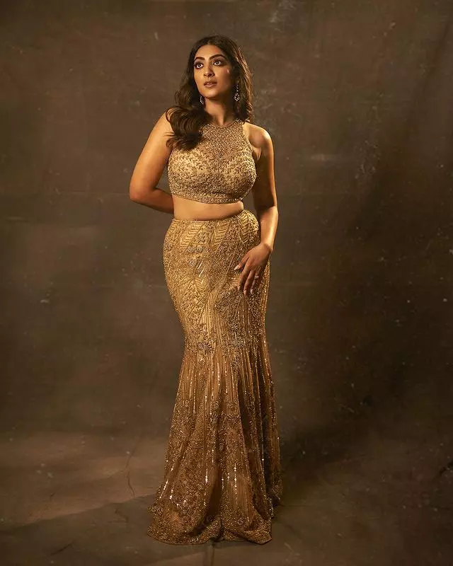 Following same, in her latest pictures, she looks stunning in a gold lehenga, outshining even the precious metal itself. The lehenga features a high neck and is adorned with white stones, giving her a regal appearance.