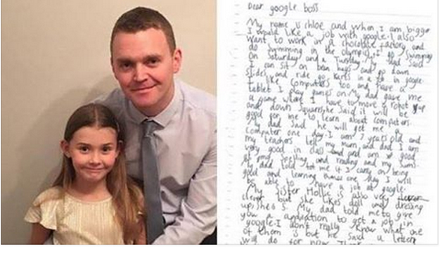 The hand written letter of Chole was addressed to Sundar Pichai as 'The Google Boss'. This Kid developed a interest for Google after a conversation with her Father Andy recently. When she asked about the ideal place to work, Her Dad said Google would be ideal as it's known for world's famous perks and cutting-edge works. When she expressed her wish to bag a job in Google, Andy suggested her to start it early and write a job application. In the letter, Chole claimed she is good student who likes computers, tablets and robots. The other two wishes of the Seven-Year-Old are working at a chocolate factory and swimming at the Olympics.