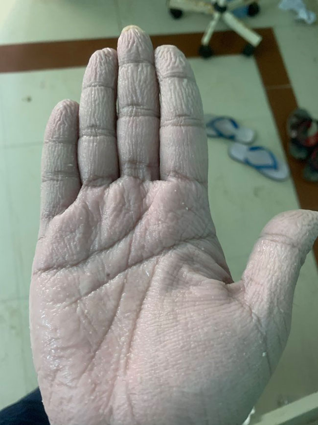 "My hands after doffing #PPE due to profuse sweating in extremely humid climate," Dr Ahmad captioned the picture.