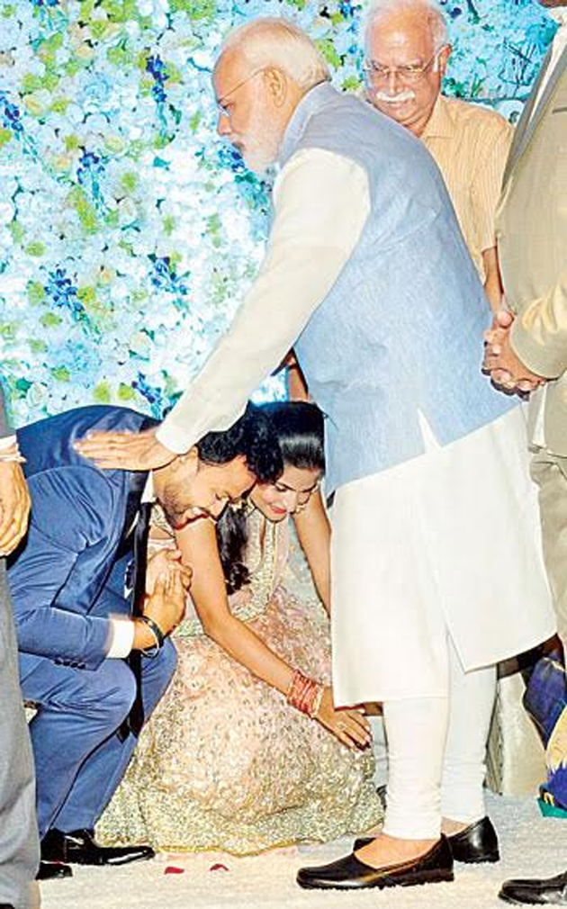 By: Tupaki Desk | 20 July 2017 6:07 PM ISTSrikakulam MP Kinjarapu Rammohan Naidu tied the knot with Sravya, Daughter of Senior TDP Legislator Bandaru Satyanarayana, last month. This dynamic MP organized his wedding reception at a star hotel in New Delhi on Wednesday night. Prime Minister Narendra Modi has attended the function to bless the newly wed couple. Rammohan Naidu & his Wife touched the feet of PM soon after he wished them a great future ahead.