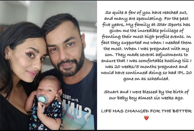 She posted the picture of her husband and newborn child and informed that if IPL had started on schedule she would have been comfortable hosting even in her pregnancy.