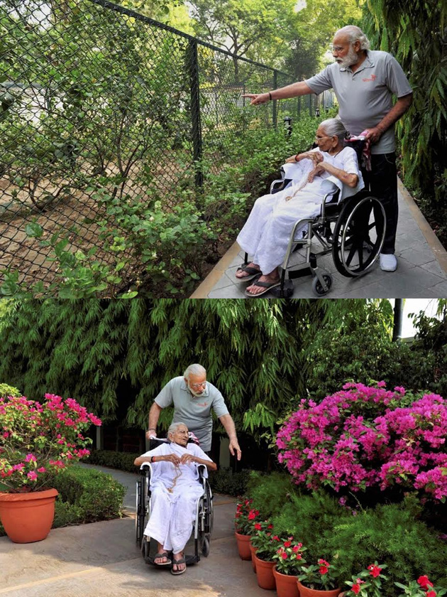 By: Tupaki Desk | 16 May 2016 12:03 PM ISTPrime Minister Narendra Modi's mother Heeraben visited his son's official residence at the 7, Race Course Road in New Delhi for the first time ever. NaMo took her Mom to every nook n corner in the residence with the help of a wheel chair. Just like a guide or caring son, He explained everything, from the type of plants in the small garden & the kind of atmosphere present there, to her mother.