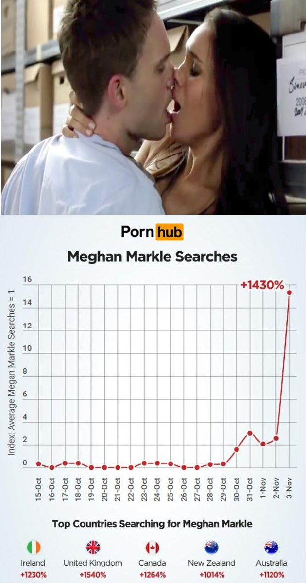 Pornhub had a huge increase in the searches for Meghan Markle's sex scenes from across the World. Especially, People of UK, Ireland, Canada, Australia and New Zealand are keen to want her intimate clips. The surge in the search for Meghan Markle's sex scenes is upto 1,430%.