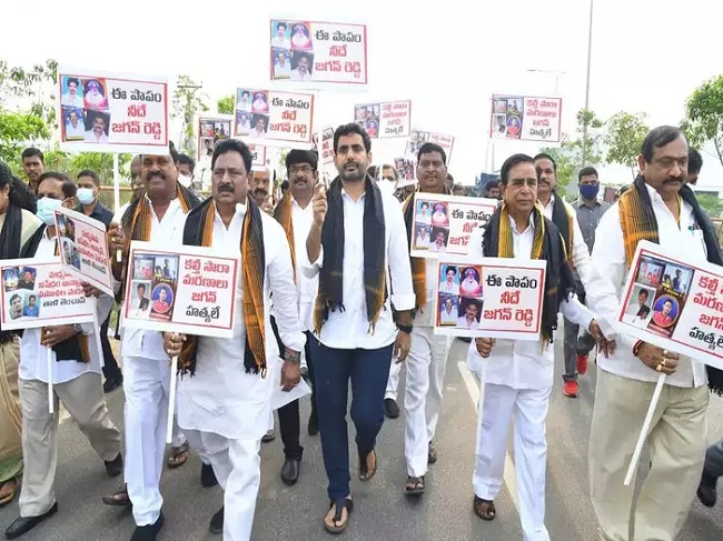 The TDP MLAs and MLCs have protested outside the Assembly by holding placards with text which says the sin of the deaths is on Chief Minister YS Jagan. The Telugu Desam Party leaders were joined by Nara Lokesh.