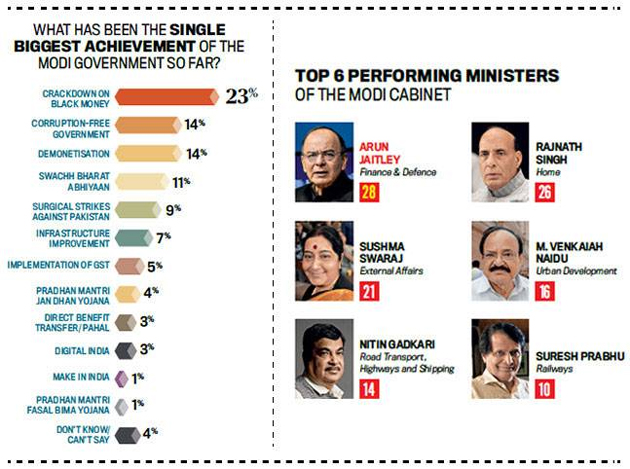 Crackdown on Black Money: 23 Percent; Corruption-Free Government: 14 Percent; Demonetisation: 14 Percent; Swachh Bharat Abhiyan: 11 Percent; Surgical Strikes: 9 Percent; Infrastructure Improvement: 7 Percent; GST: 5 Percent; Pradhan Mantri Jan Dhan Yojana: Rs 4 Percent; Direct Benefit Transfer: 3 Percent; Make In India: 1 Percent; Pradhan Mantri Fasal Bima Yojana: 1 Percent; Can't Say: 4 Percent.
