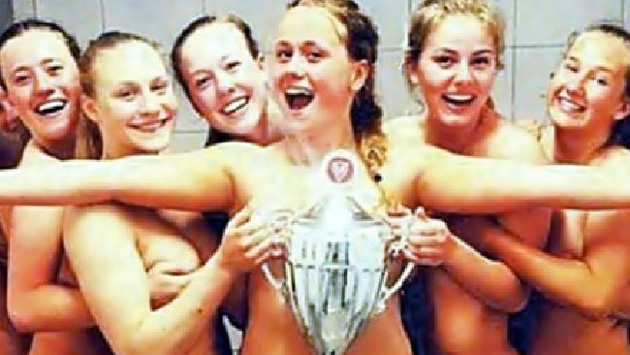 The entire team took shower together and posed bear with the trophy and used their hands to hide their modesty. This is their third trophy in the past four years and the girls can't control their excitement.