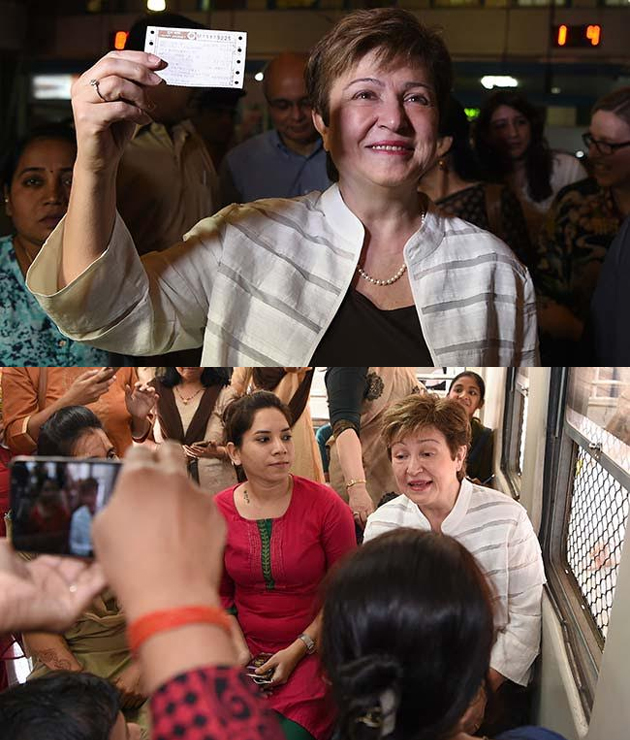 Kristalina travelled in the 2nd Class Women's Compartment of a Western Railway suburban train. She interacted with the passengers about the various aspects of the local train. Commuters competed for selfies with the World Bank CEO.