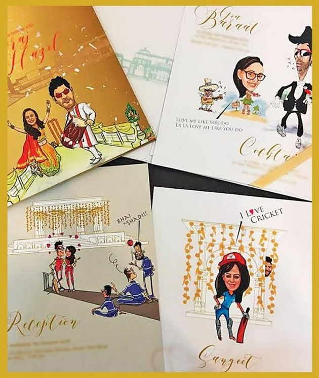 The designers have also come up with a postal stamp featuring caricatures of Yuvraj Singh and Hazel Keech. Even the Goa wedding invite will be more or less similar.