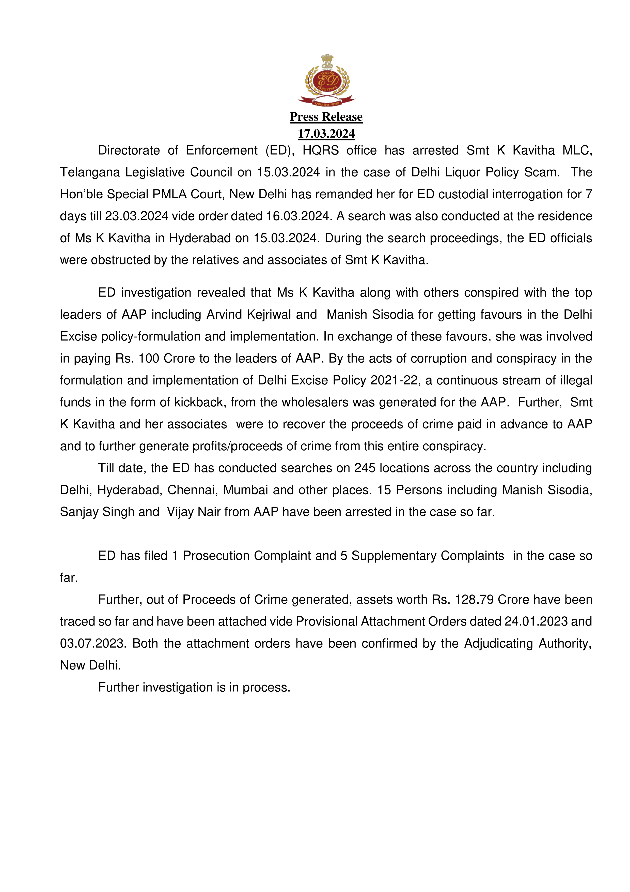 Listing out what had happened in the case so far, ED said that the raids were conducted in 245 places including Delhi, Hyderabad, and other places. 15 people were arrested in the case including Kavitha. So far Rs 128.79 cr was seized in the case by the agency.