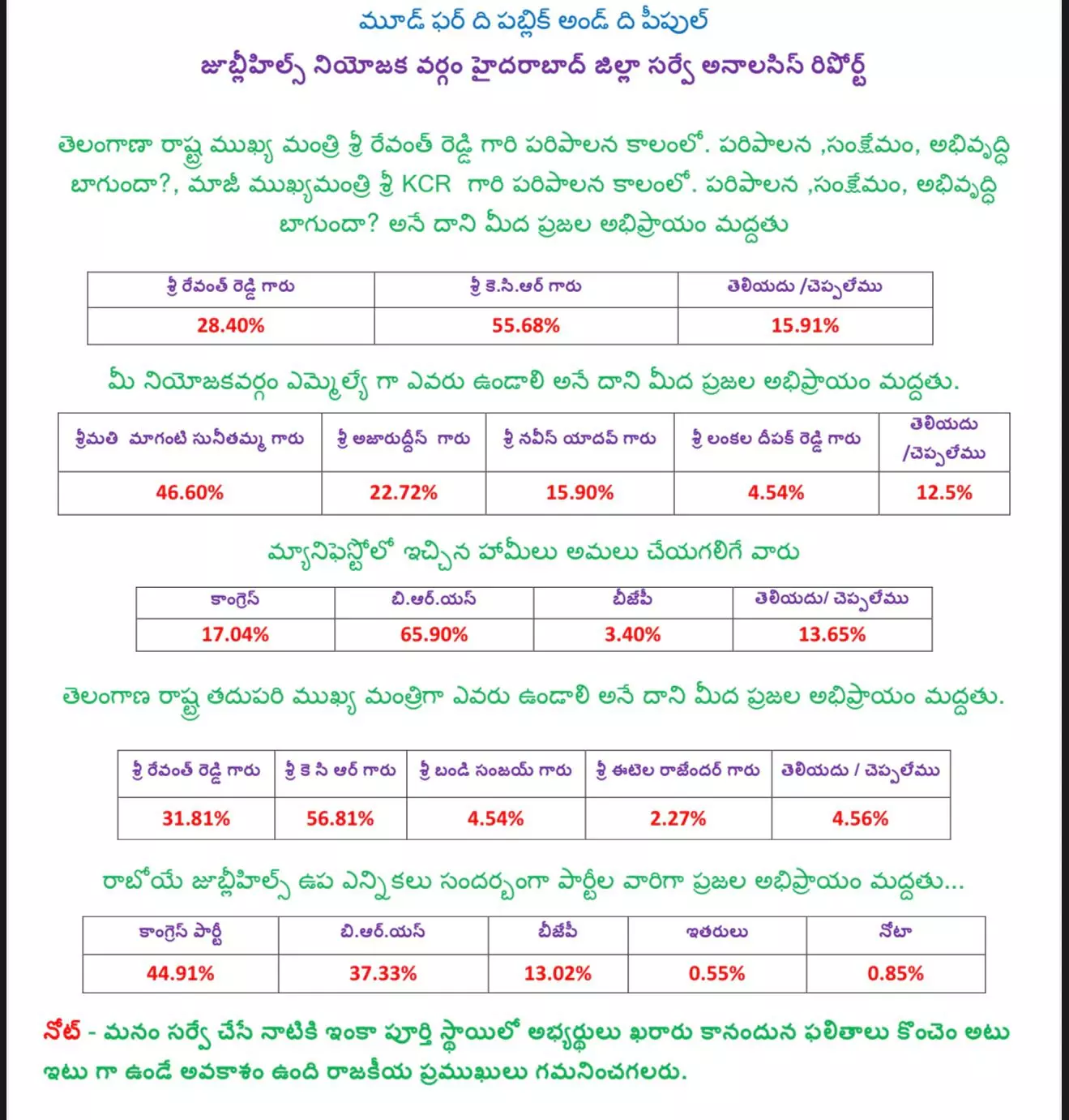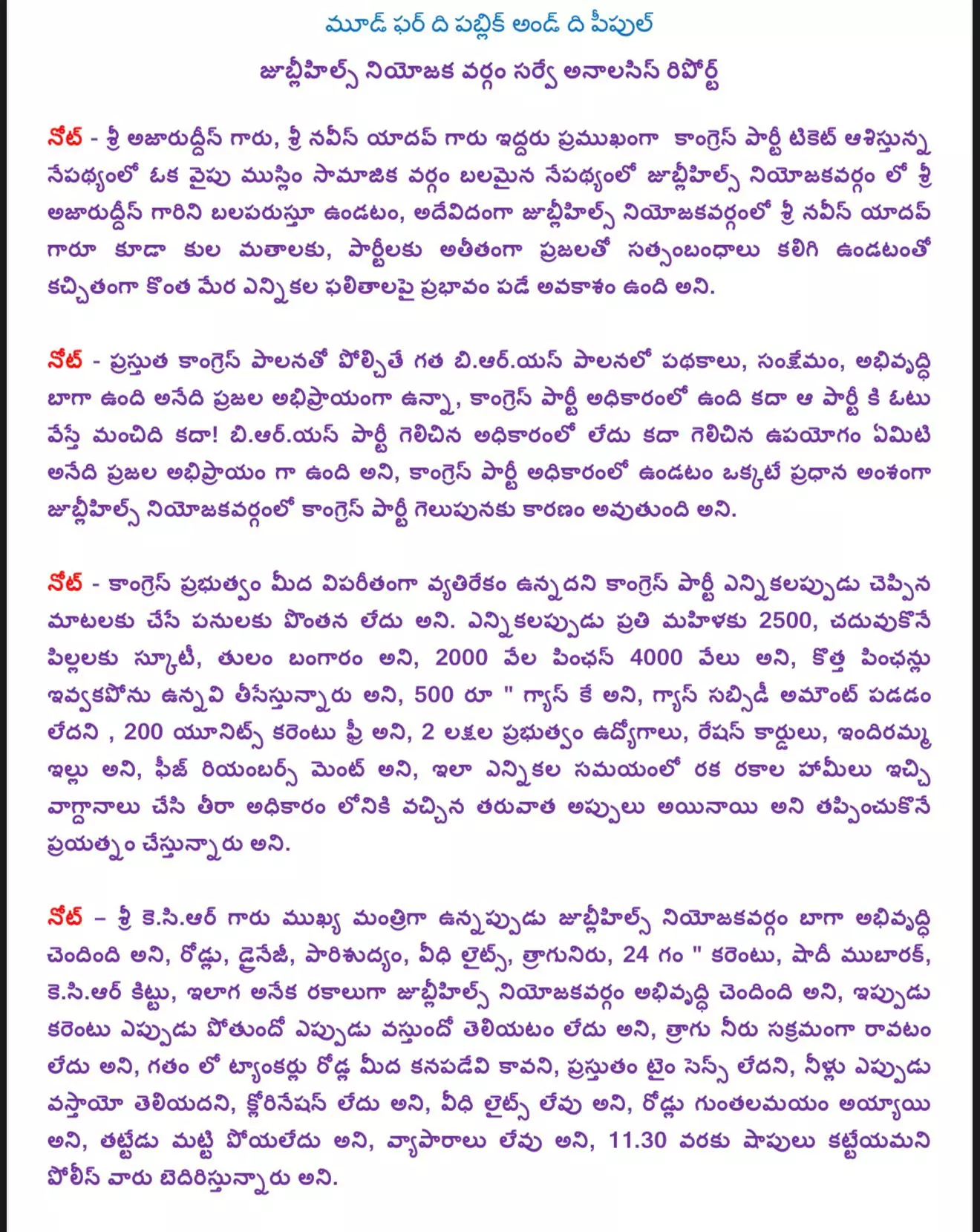 But at the same time, the analysis notes suggest that Azharudding and Naveen Yadav splitting the Congress vote may help Sunita Reddy. BRS’s strong presence in municipalities gives them an advantage. Congress is focusing on organizational strength, large rallies, and door-to-door campaigning, while BRS relies on KCR’s popularity and established networks.The survey indicates a close contest, with BRS dominant locally.