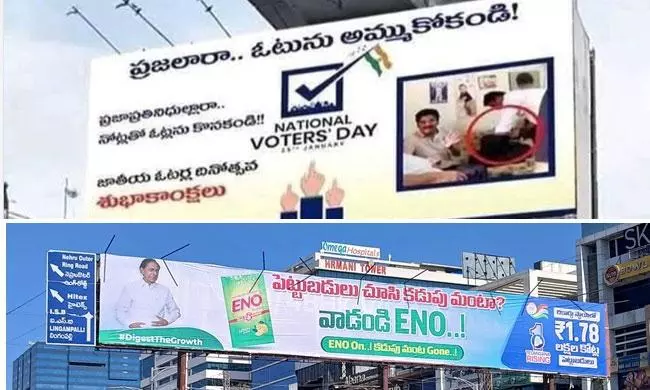 By: Tupaki Desk | 27 Jan 2025 11:22 AM ISTHyderabad's streets have become the battleground for a unique form of political confrontation, commonly referred to as a "poster war" between the ruling Congress party and its rival, the BRS. This unconventional clash involves the use of strategically placed hoardings, each aiming to outdo the other with provocative and witty messages. It all started with the BRS putting up a billboard featuring an image from the "note-for-vote" scandal involving Congress leader Revanth Reddy, accompanied by a caution to the public against selling their votes.