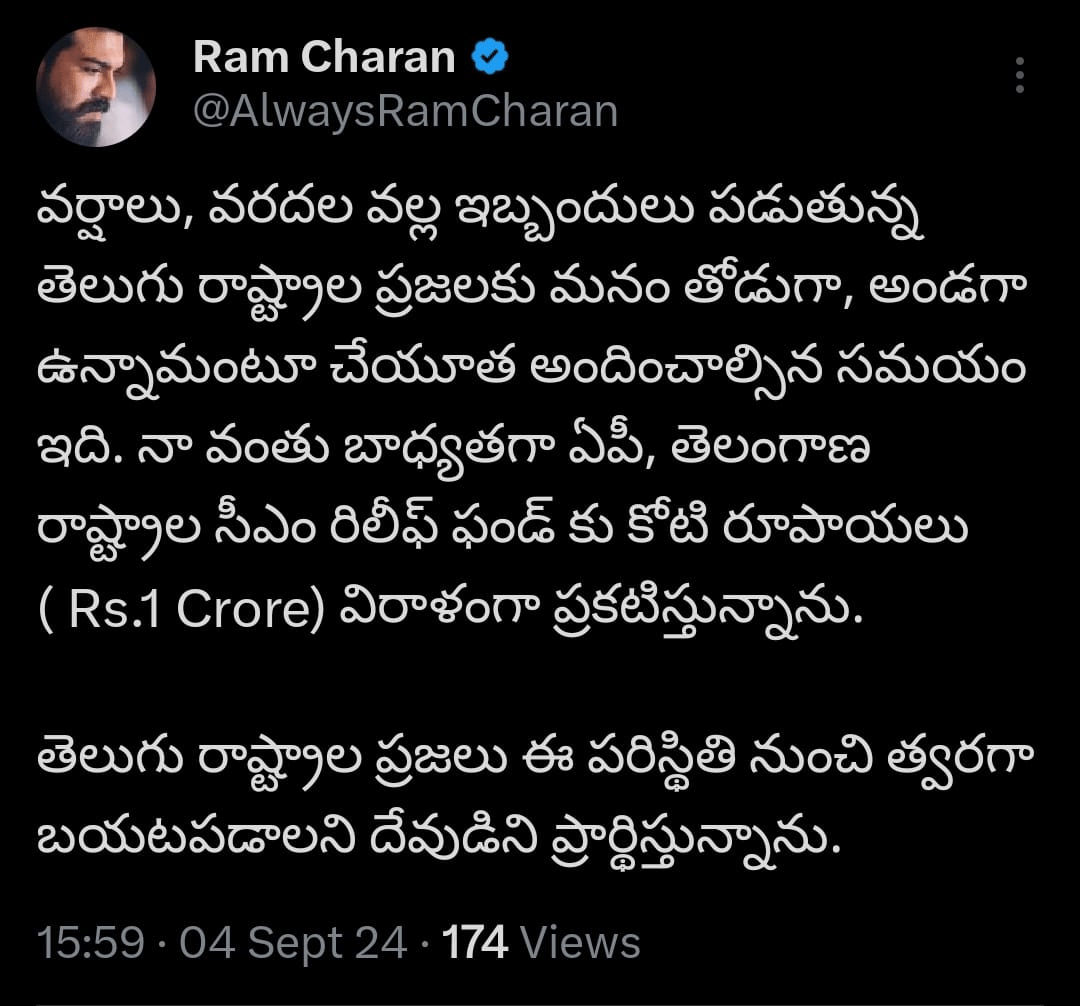 Mega Power star Ram Charan is moved by the problematic situation in the Telugu states. He said that the time has arrived to stand in support of the Telugu people who are facing issues with the floods.