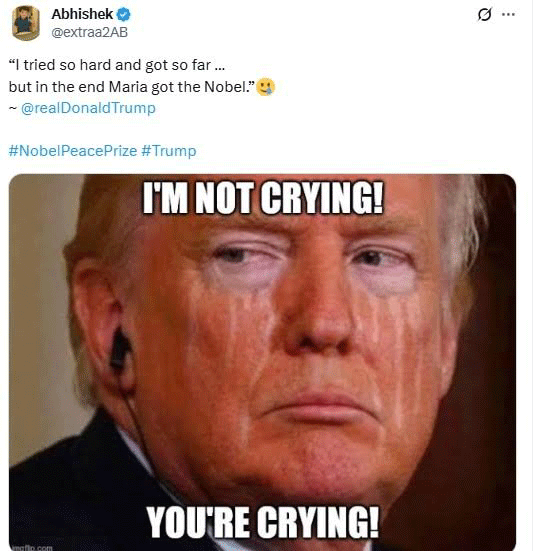 In this context, social media is now filled with posts about Trump missing out on the Nobel Award. He is clearly facing a lot of social media meme stuff after this historic slip up.